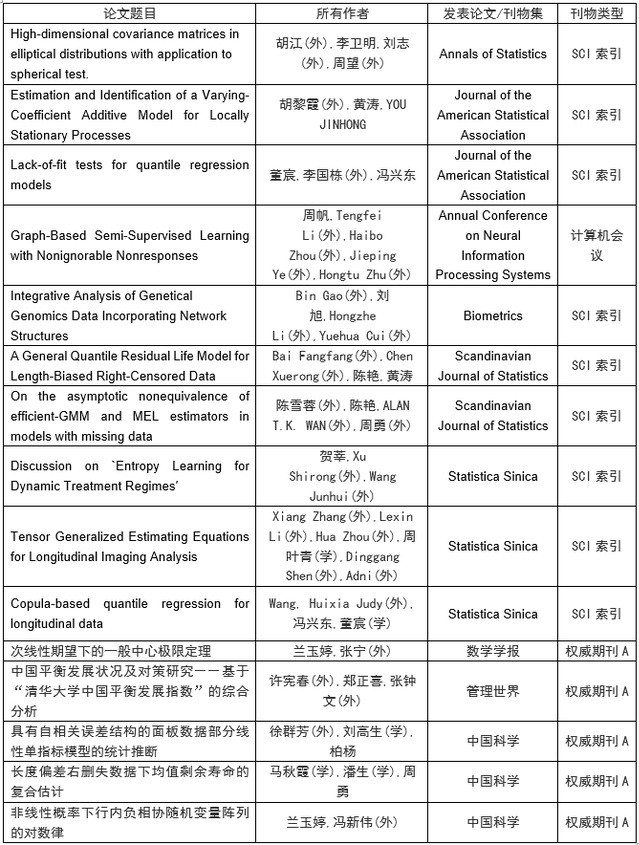 2019年,统计与管理学院共发表学术论文77篇。其中在外文期刊上发表学术论文59篇,在中文期刊上发表论文18篇,包括在《Management Science》、《Annals of Statisitics》等统计学、管理学国际顶级杂志发表论文4篇,在《Biometrics》等国际一流杂志发表(含录用)论文6篇,在国内《中国科学》等国内高水平期刊上发表论文5篇。