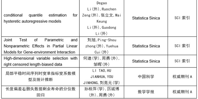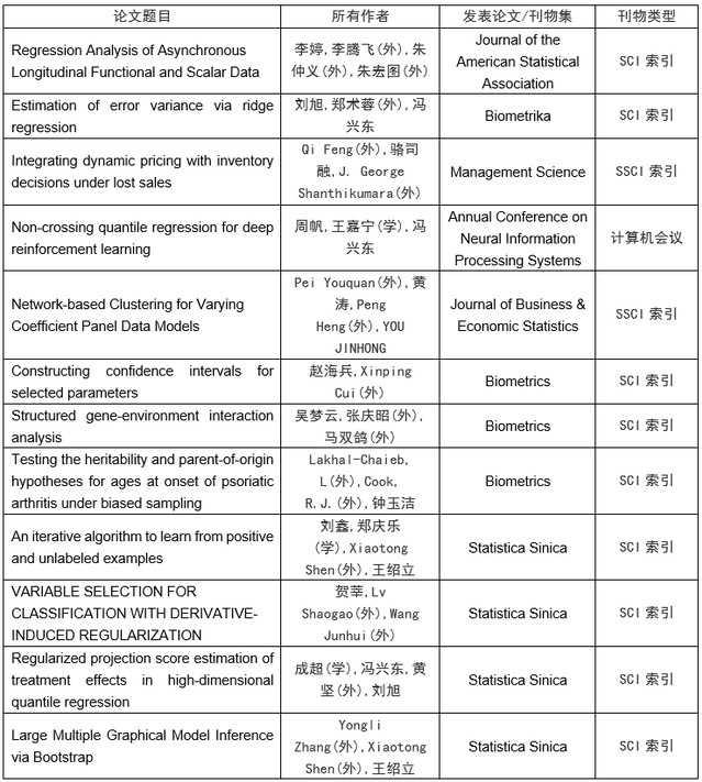 2020年,统计与管理学院共发表学术论文80篇。其中在外文期刊上发表学术论文68篇,在中文期刊上发表学术论文12篇,包括在《Journal of the American Statistical Association》、《Journal of Econometrics》等统计学、经济学国际顶级杂志发表论文4篇,在《Biometrics》等国际一流杂志发表(含录用)论文11篇, 在《中国科学》《数学学报》等国内高水平期刊上发表论文2篇。