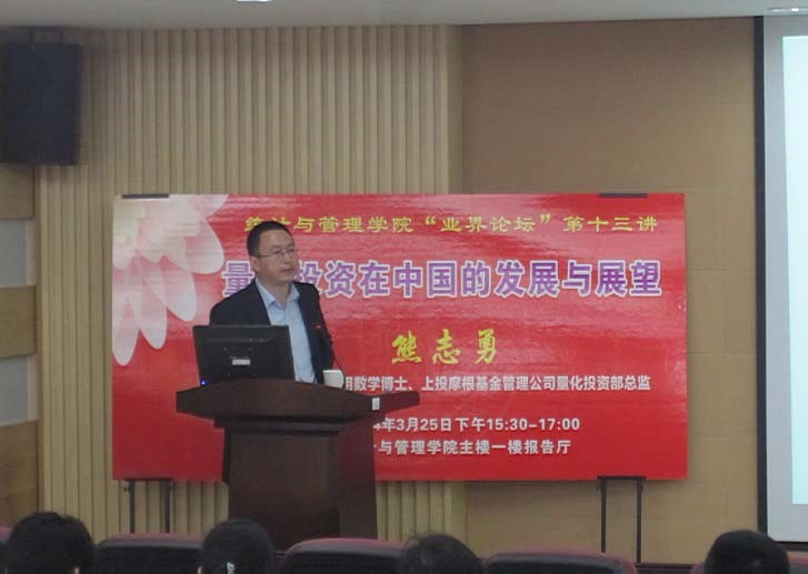 3月25日,统计与管理学院“业界论坛”第十三讲如期举行,此次由上投摩根基金管理公司量化投资部总监熊志勇为我院学生做讲座。