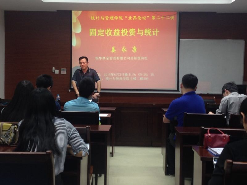 2015年6月3日,银华基金管理有限公司总经理助理姜永康应邀来学院为2014级应用统计专业硕士做了题为”固定收益投资与统计“的讲座。本次讲座由2014级应用统计专硕班的麦子俊同学主持,全班同学出席并认真聆听了这次讲座。
