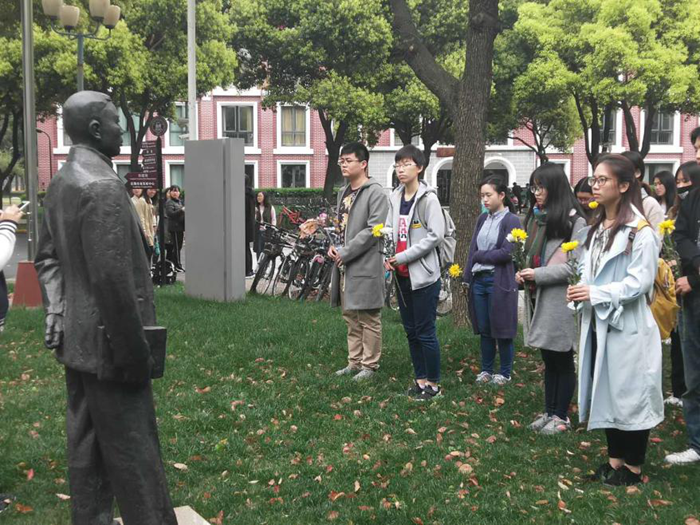 2018年清明节,在财大百年的新时下,在清明的和风微雨里,上海财经大学统计与管理学院、人文学院、法学院各位党校学员来到了伫立在校园三处的郭秉文、孙冶方、马寅初雕像面前,联合进行了“清明祭先贤,匡时志传远”清明献花活动,向财大先贤们致以崇高的敬意。