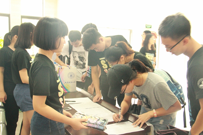 大约七点半,新生们陆陆续续地开始前来报到。团学联的主席部长们分工明确,热情高效。有的站在门口为新生引路,介绍报道的整体流程;有的站在桌前,指引新生签到,交给他们精心准备的资料袋;有的站在宣传板旁边,宣传学院微信群公众号;有的部长拿着DV采访新生和家长的感受;还有的捧着相机,记录这热闹温馨的场面和工作人员的点点滴滴……早在新生群里与学长学姐打地火热的新生报到时毫不拘束,与迎新的部长们亲切地攀谈,轻松地开玩笑。也有些新生较为羞涩,在学长学姐的带领下也慢慢放松下来,顺利地完成了报到。