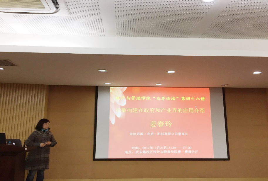 2017年11月21日下午3:30,在统计与管理学院(主楼)一楼报告厅召开了“业界论坛”第四十八讲讲座。龙信思源(北京)科技有限公司董事长、中关村大数据产业联盟副秘书长、我院研究生兼职导师姜春玲女士受邀作为此次主讲人,为统管学子带来了一场以“生活性服务业品质提升指数的构建与应用”为主题的业界论坛讲座。
