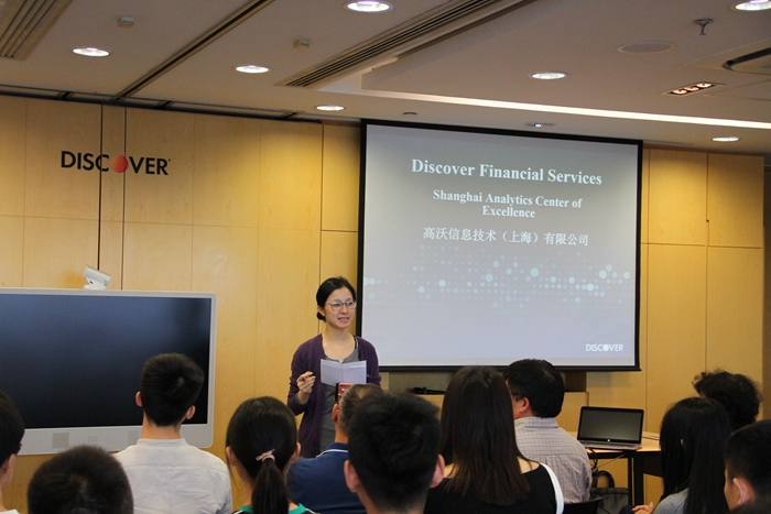 在会议室,石总监以Discover为案例,为大家上了一堂实践课。在介绍过程中,石总监向专业硕士生表明敢于创新是是Discover能够走在行业前列的重要原因,并希望专业硕士生能着重培养利用所学知识解决实际问题的能力。在此基础上,石总监为专业硕士生讲解了什么是决策分析、决策分析如何指导实际问题的解决以及决策分析在金融服务行业的应用等等。演讲的最后,石总监为专业硕士生介绍了Discover对员工的培训,让有意愿加入Discover的专业硕士更加清楚自己今后的发展方向。