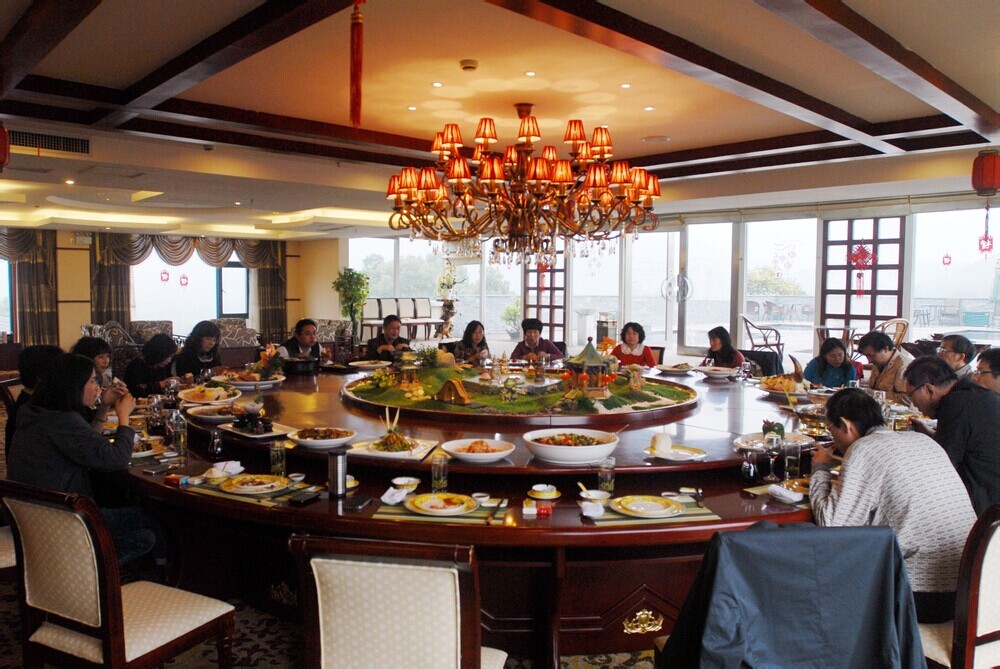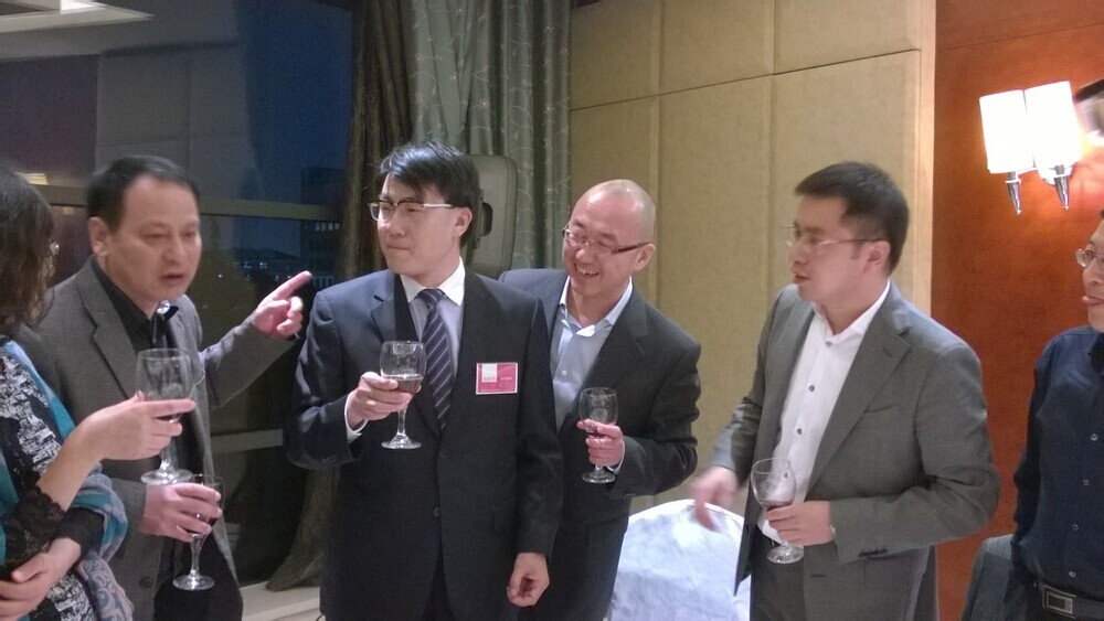 在7日在豪生大酒店三楼香港厅专门为在外地同学接风的晚餐中,上海财经大学合作发展处副处长张彦波(左3,挂胸卡者)也赶来看望老校友们。左4是我们同学腾国纬,他现在是上市公司金丰投资(600606)的总经理。