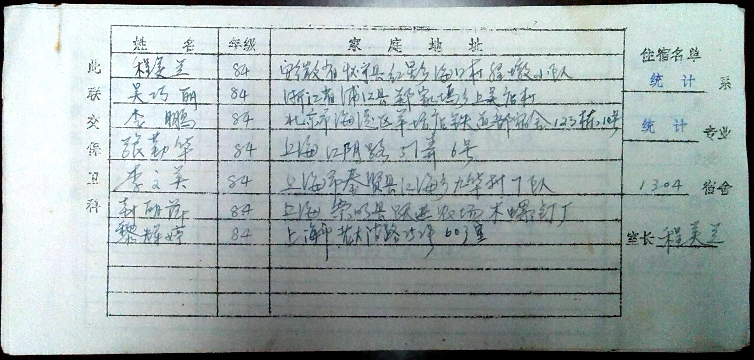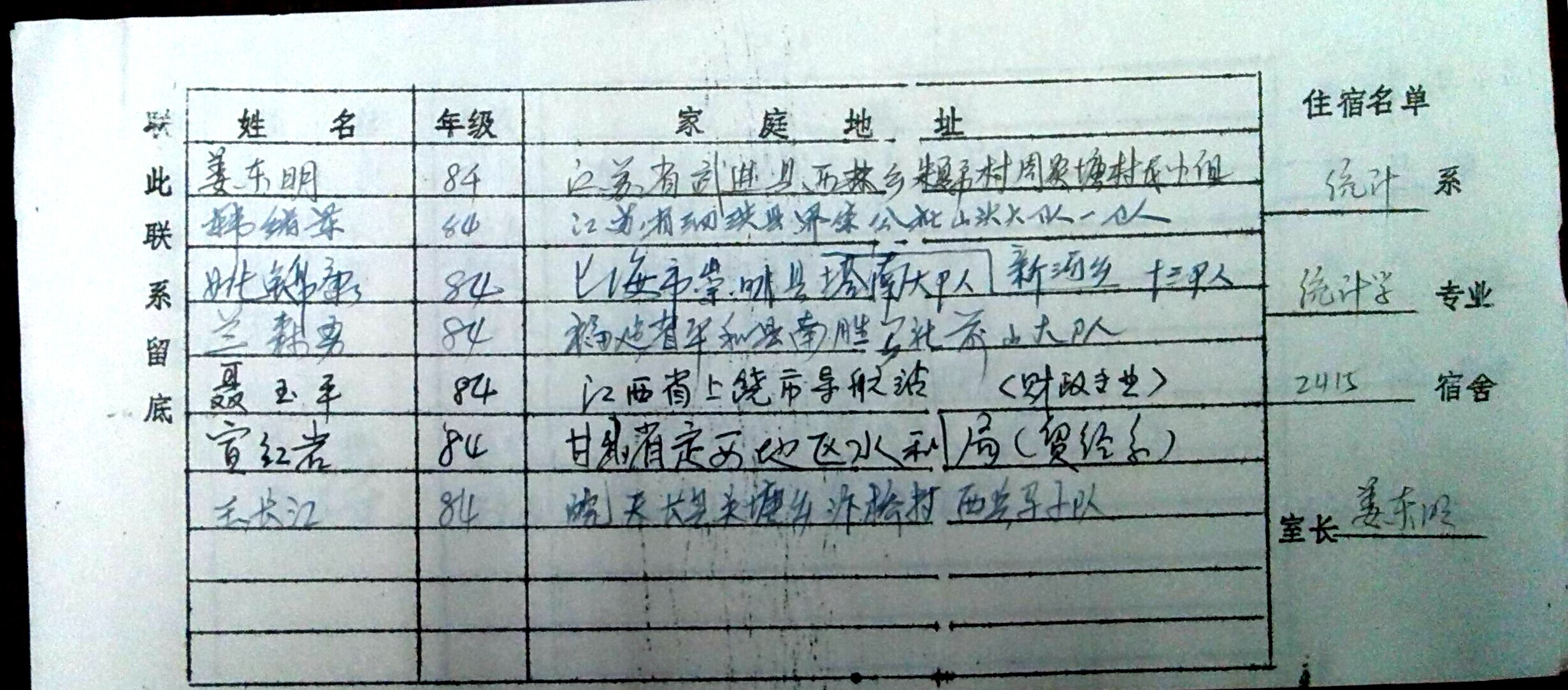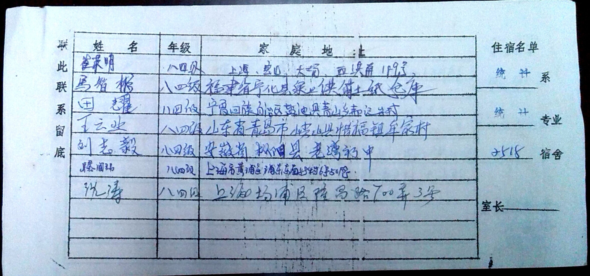 在国定路校区 84级统计班同学寝室成员的首次分布记载(见附录图)