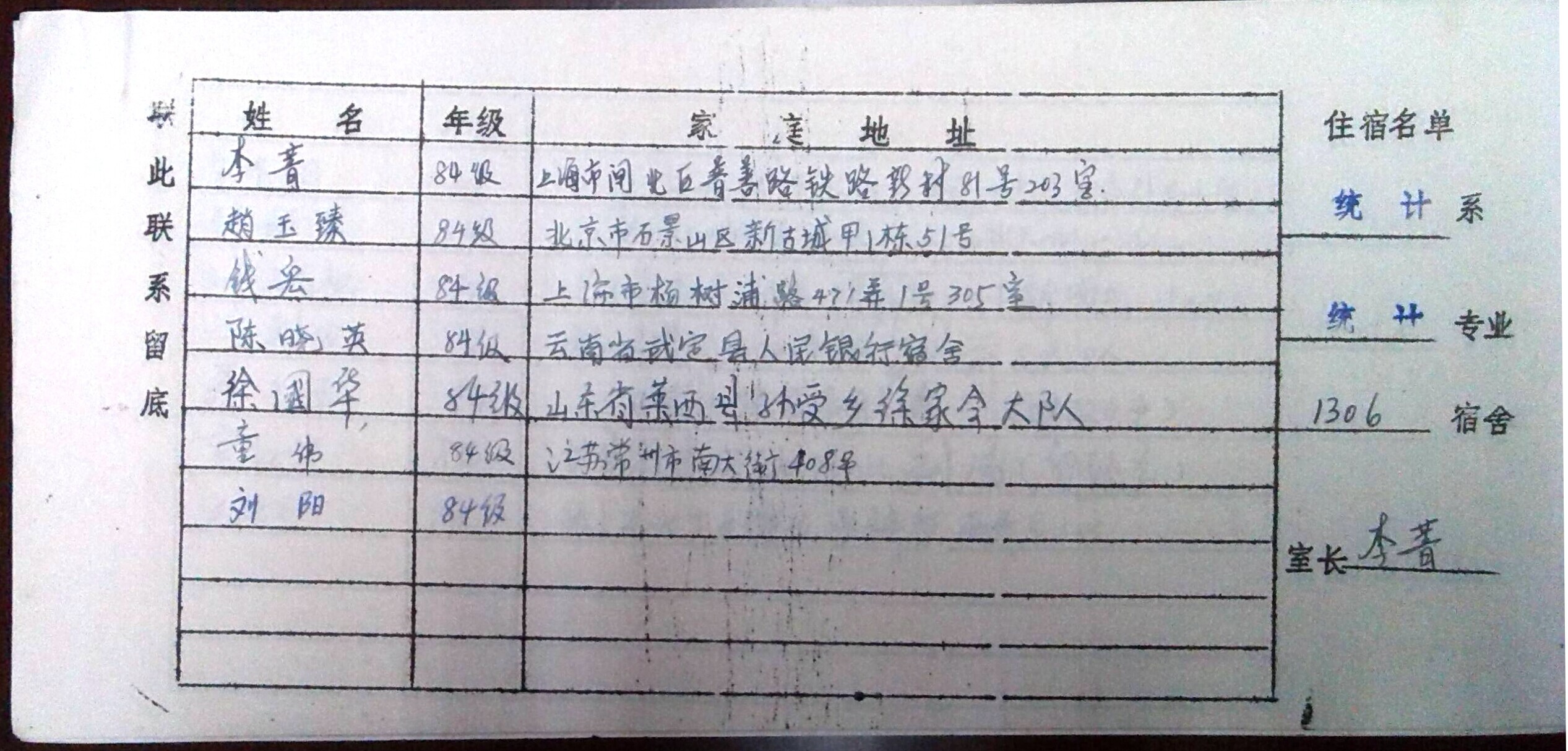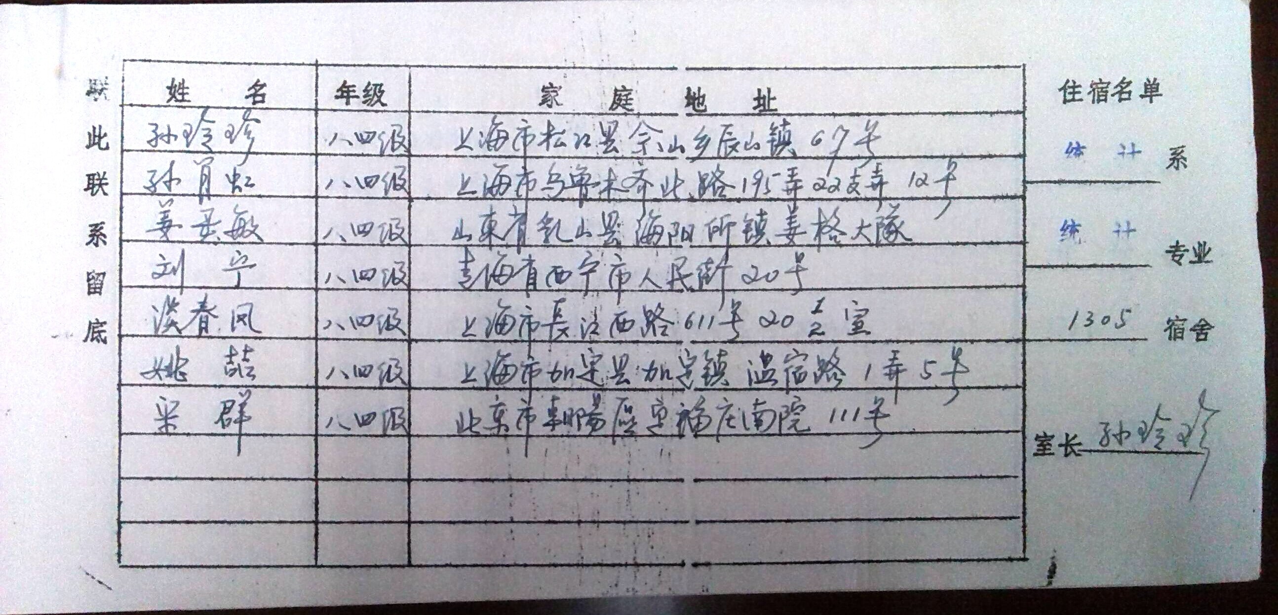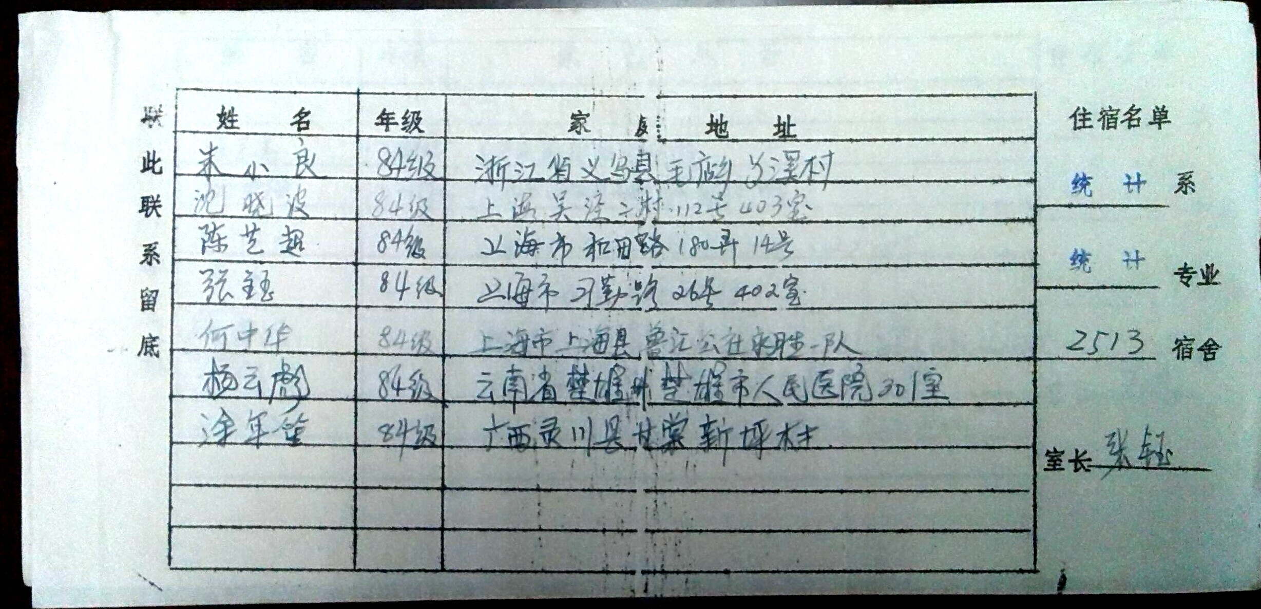 在国定路校区 84级统计班同学寝室成员的首次分布记载(见附录图)