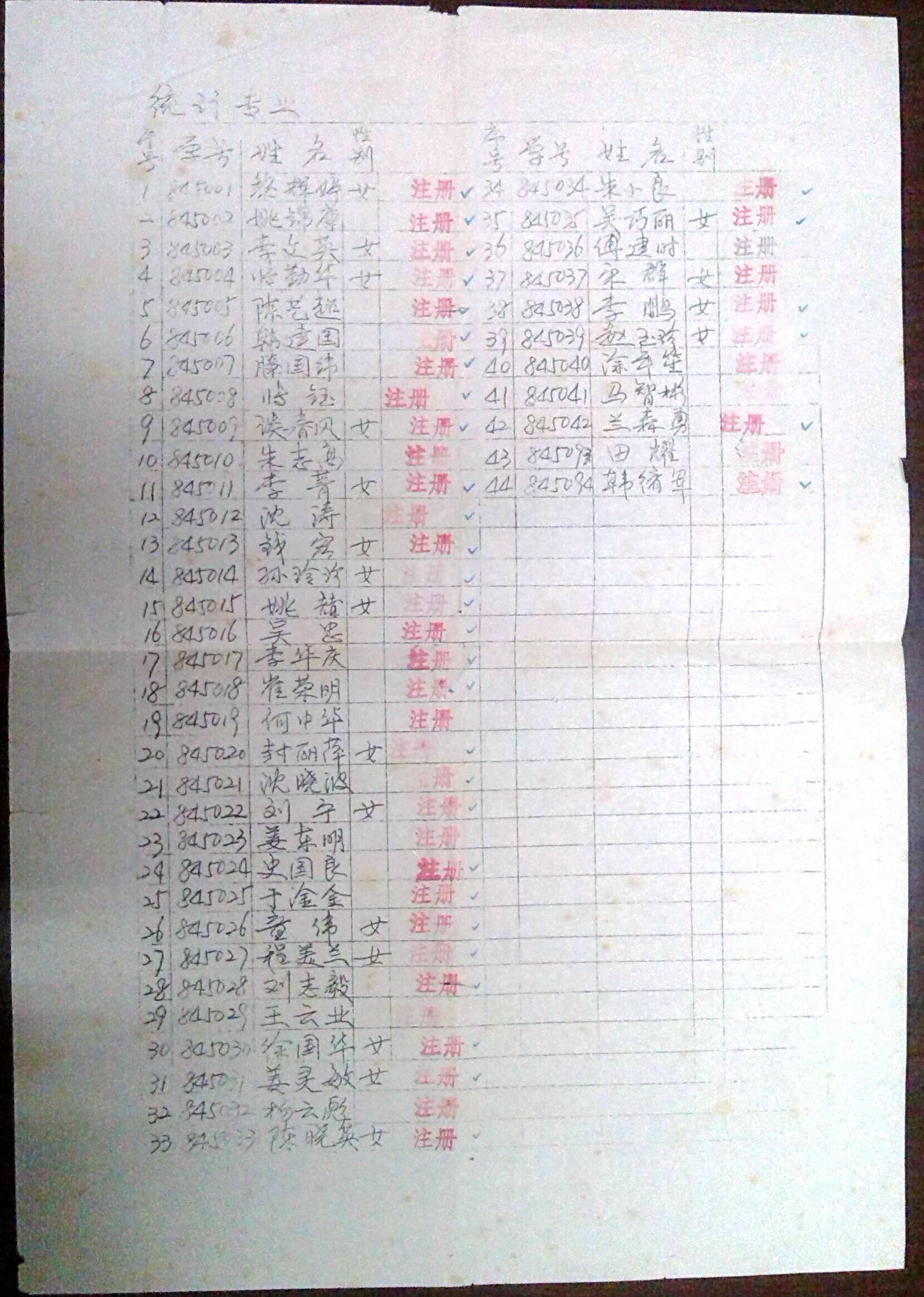 有同学从老师那里看到了保存有30年之久的班级“历史文物”,更增添了怀旧感。下面是1984年9月14日报到当日的原始记载。以及当时寝室成员的首次分布记载(略)。