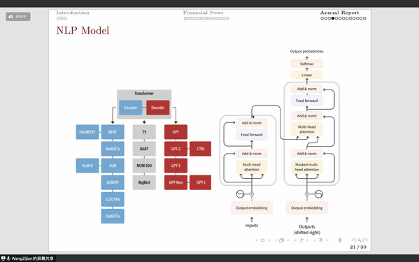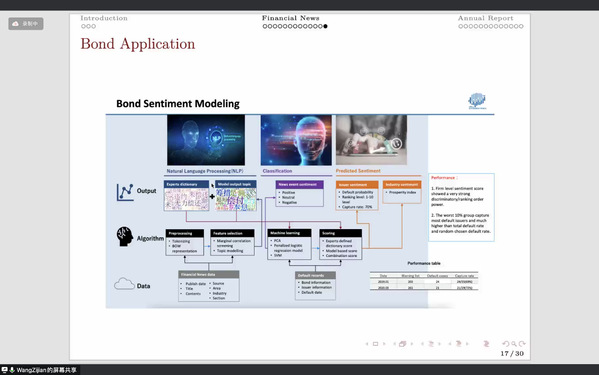 之后,王子剑老师分别针对金融经济新闻数据和上市公司定期与非定期报告文本数据,详细介绍了自然语言处理在金融领域中应用的具体研究方法和研究成果。老师从统计模型角度,机器学习和深度学习模型角度介绍最新的NLP研究进展、金融领域的应用成果和发展方向。