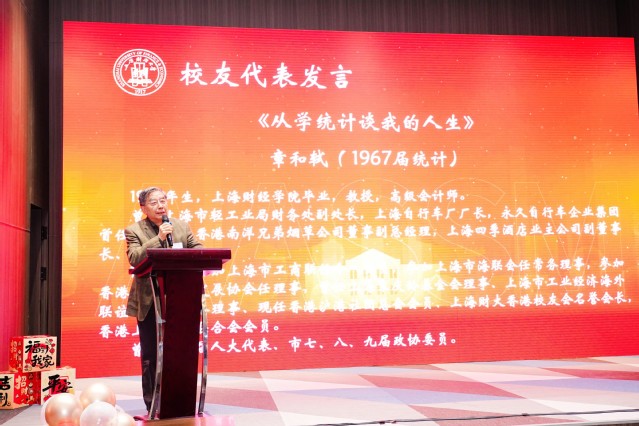 随后,67届统计专业校友、香港校友分会名誉会长章和轼先生作为校友代表发言。章和轼先生以《从学统计谈我的人生》为题,分享了自己的人生感悟与岁月沉淀的智慧。深情回望了在财大的求学时光,感慨统计专业赋予的逻辑思维与综合分析能力让自己受益终生,母校老师的谆谆教诲始终指引着人生方向。章老还回顾了与友人共同创办财大香港校友分会、为母校发展倾情助力的珍贵过往,并用“为民办实事便是高尚,健康平安便是福气,努力耕耘便是美德”的人生信条,传递了老一辈财大人的责任与担当,深深打动了在场每一位校友。