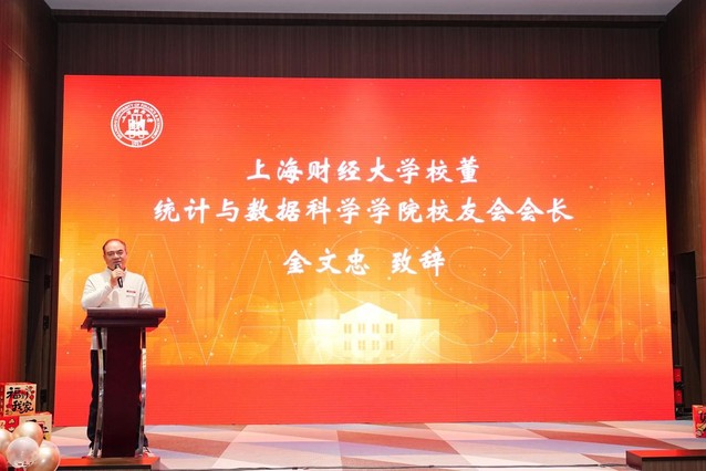 上海财经大学校董、统计与数据科学学院校友分会会长金文忠在致辞中,回顾了校友分会的发展历程,强调了校友情谊的珍贵与校友分会平台的桥梁作用,呼吁全体校友继续凝心聚力,传承财大精神,共同助力学院与校友分会的蓬勃发展。