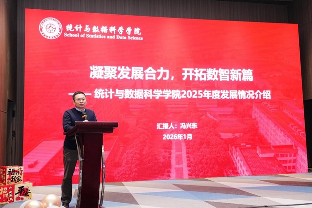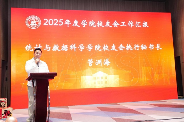 统计与数据科学学院校友分会执行秘书长管洲海汇报了2025年度校友分会工作,详细阐述了校友分会在联络校友、搭建交流平台、服务校友发展、反哺学院建设等方面所做的努力与成效,并表示未来将继续创新服务模式,让校友分会成为校友们温暖的“精神家园”。